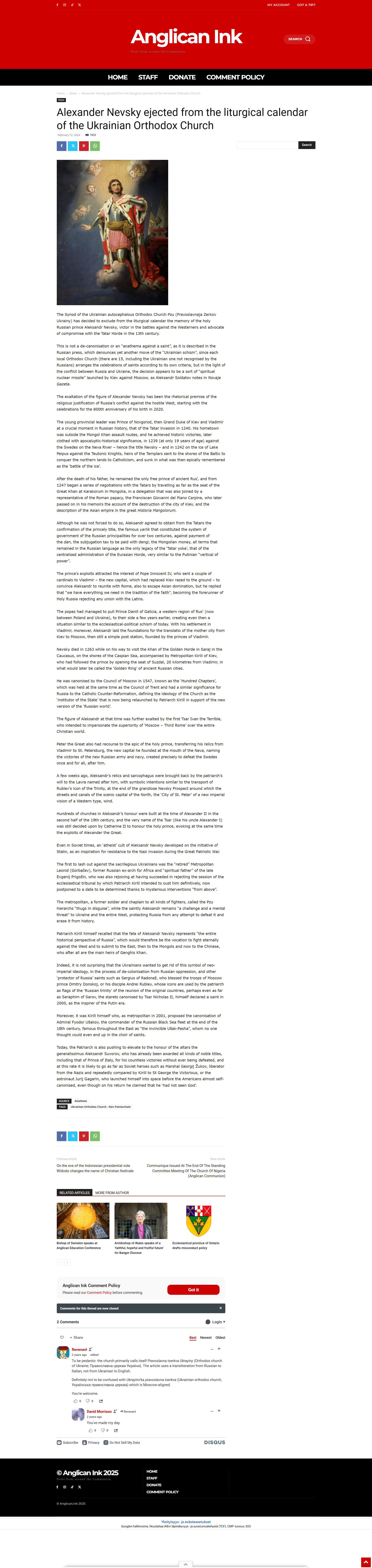 Alexander Nevsky ejected from the liturgical calendar of the Ukrainian Orthodox Church