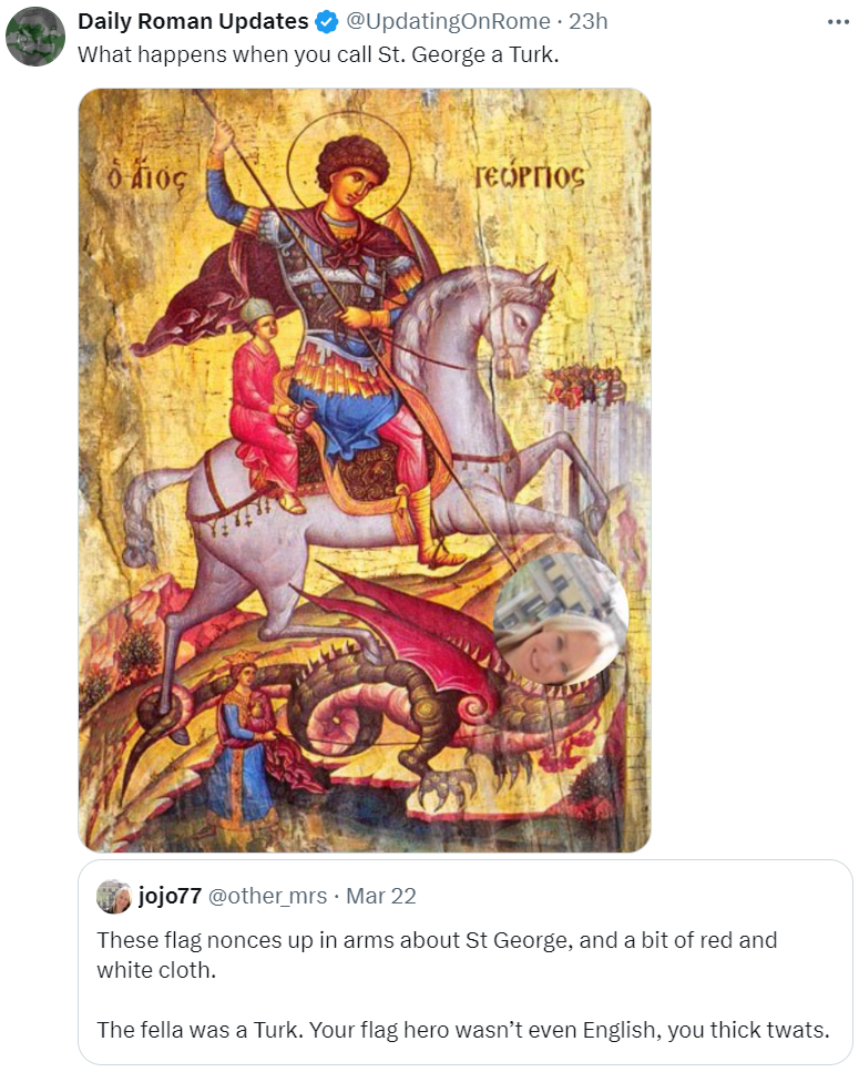 so okay, what kind of Orthodox Christians am I talking about? I've seen quite a few, for example, Christofascists who think the Holocaust was a nice thing. As if Orthodox Christians weren't also killed in the Holocaust, and do they even know the fuck about the Croatian Ustashe who killed Serbs for their faith if they refused to convert to Catholicism? How does it feel to pay church tax to a church that honors Saint Mary of Paris? a Russian nun who died in concentration camps when she helped Jews out of Nazi-occupied France and offered them baguette bread to eat? That's why she's holding a baguette in her hand in some icons. then what the fuck are all these Greek Christofascists, Mussolini and especially Hitler starved your people.